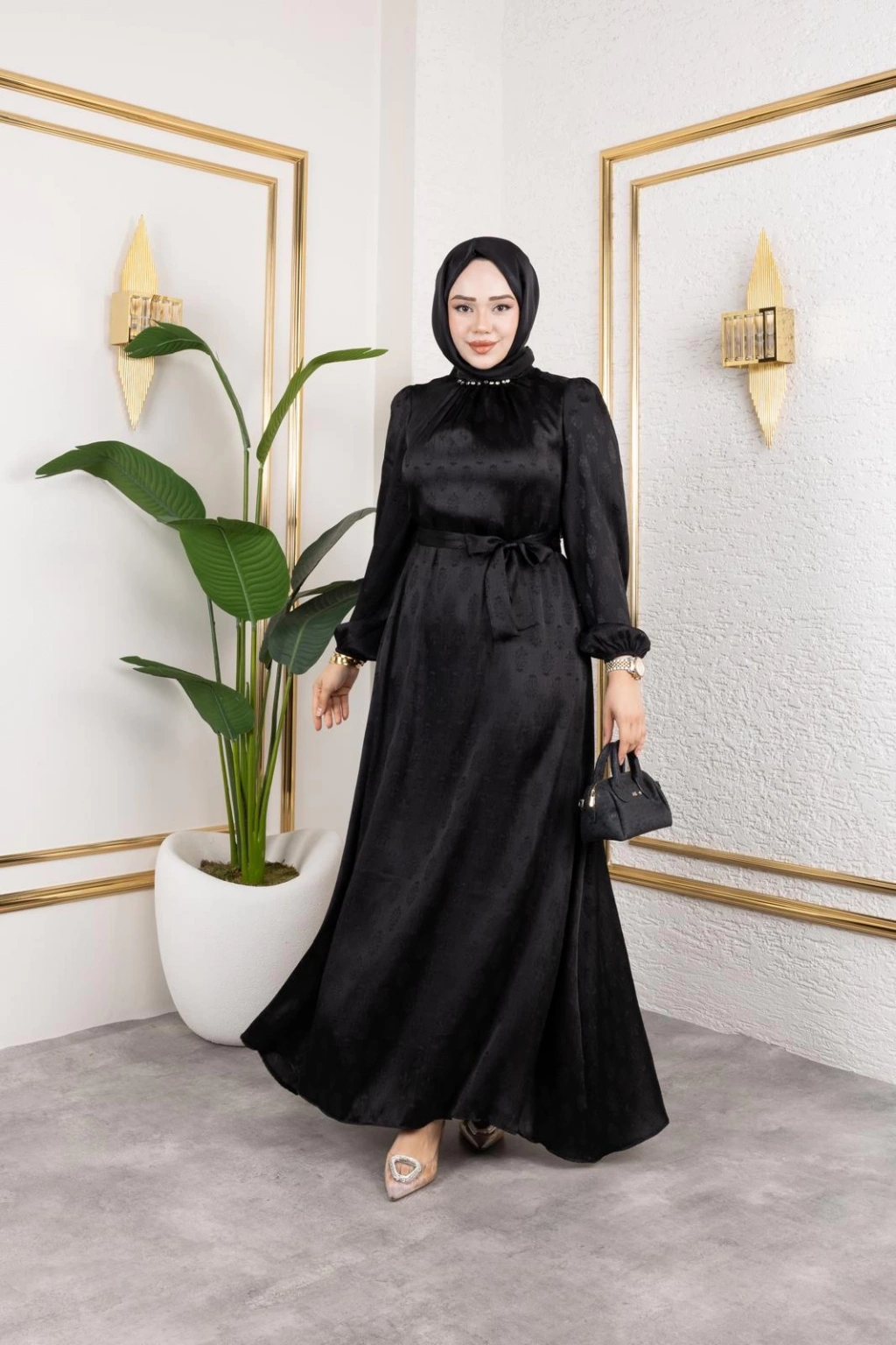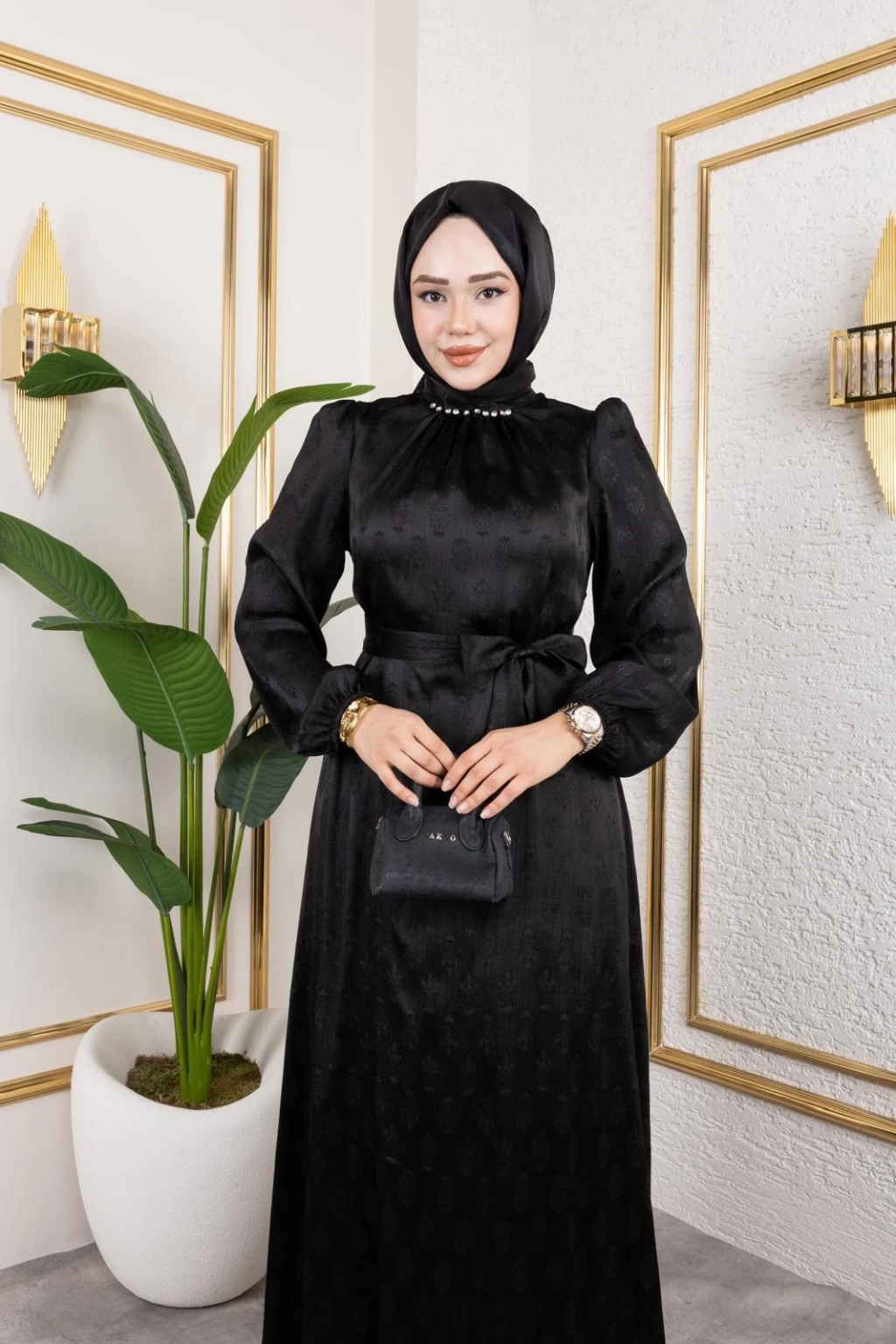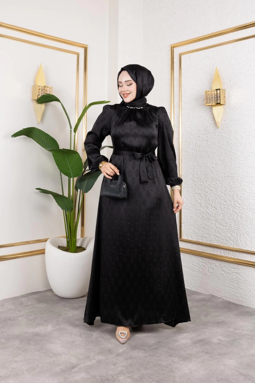 • Sudem Siyah Saten Elbise, 1.45 boyunda, inci taş detaylı şık bir seçenektir.